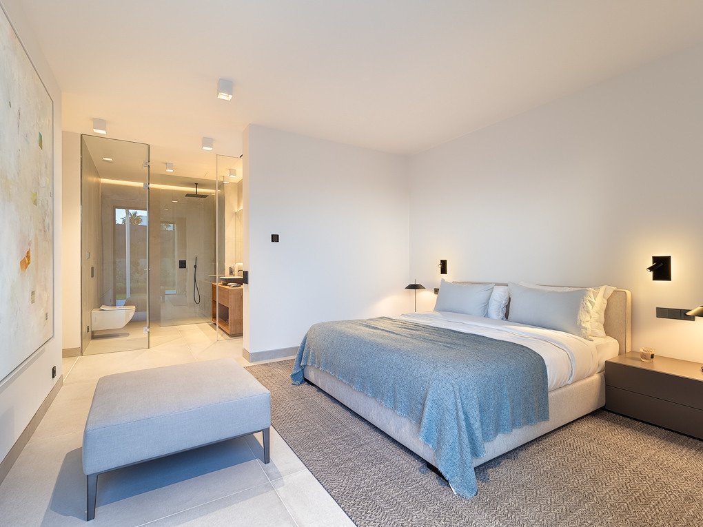 The villa has a living area including an open kitchen in modern style, light-flooded rooms and a view of the spacious outdoor area with pool and terrace. A guest toilet is also available here.
