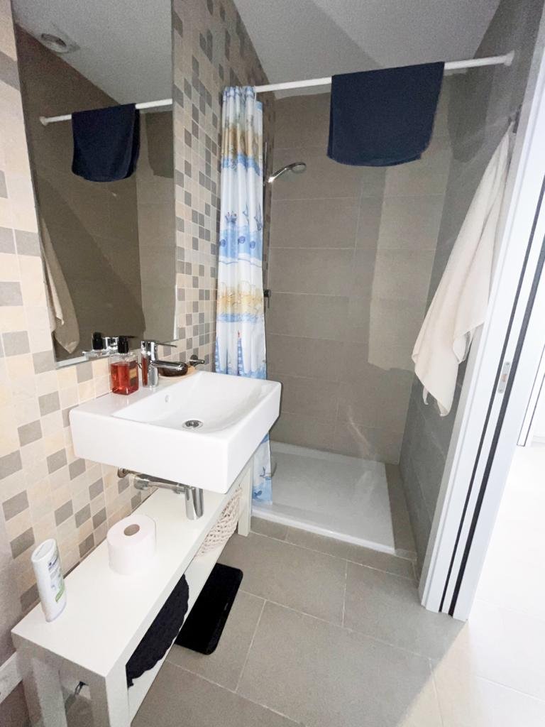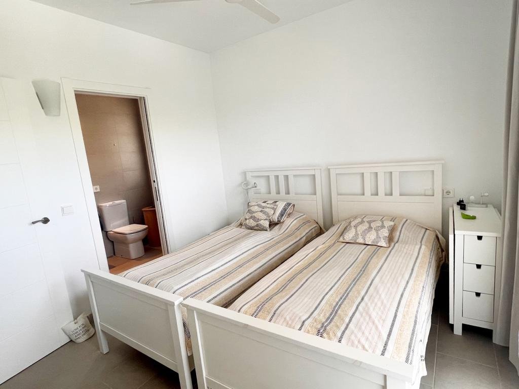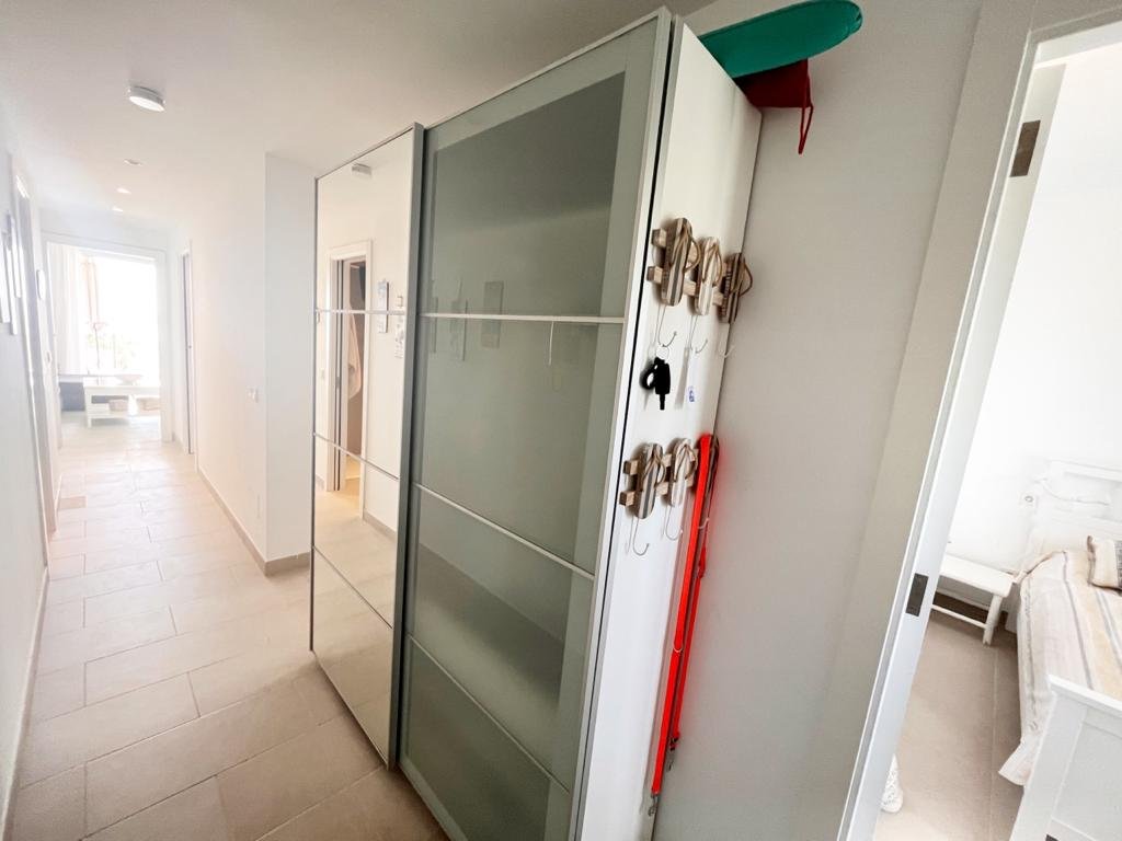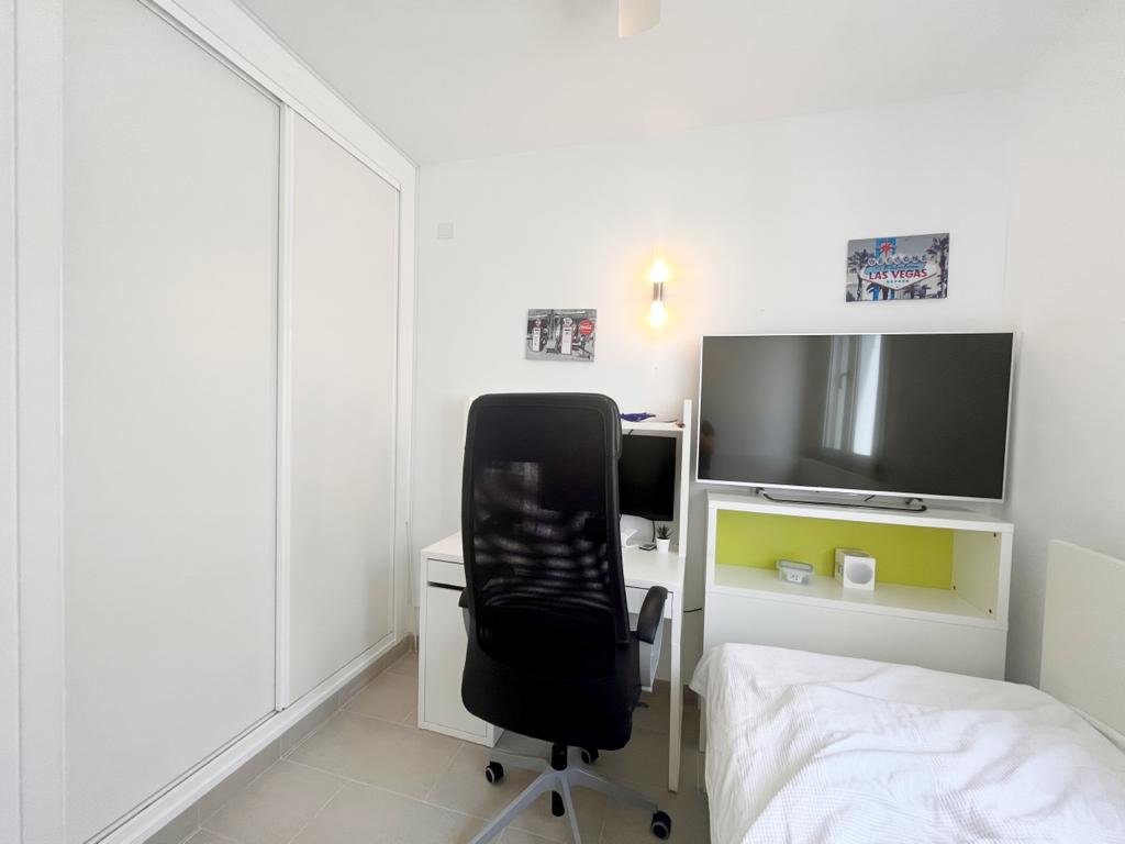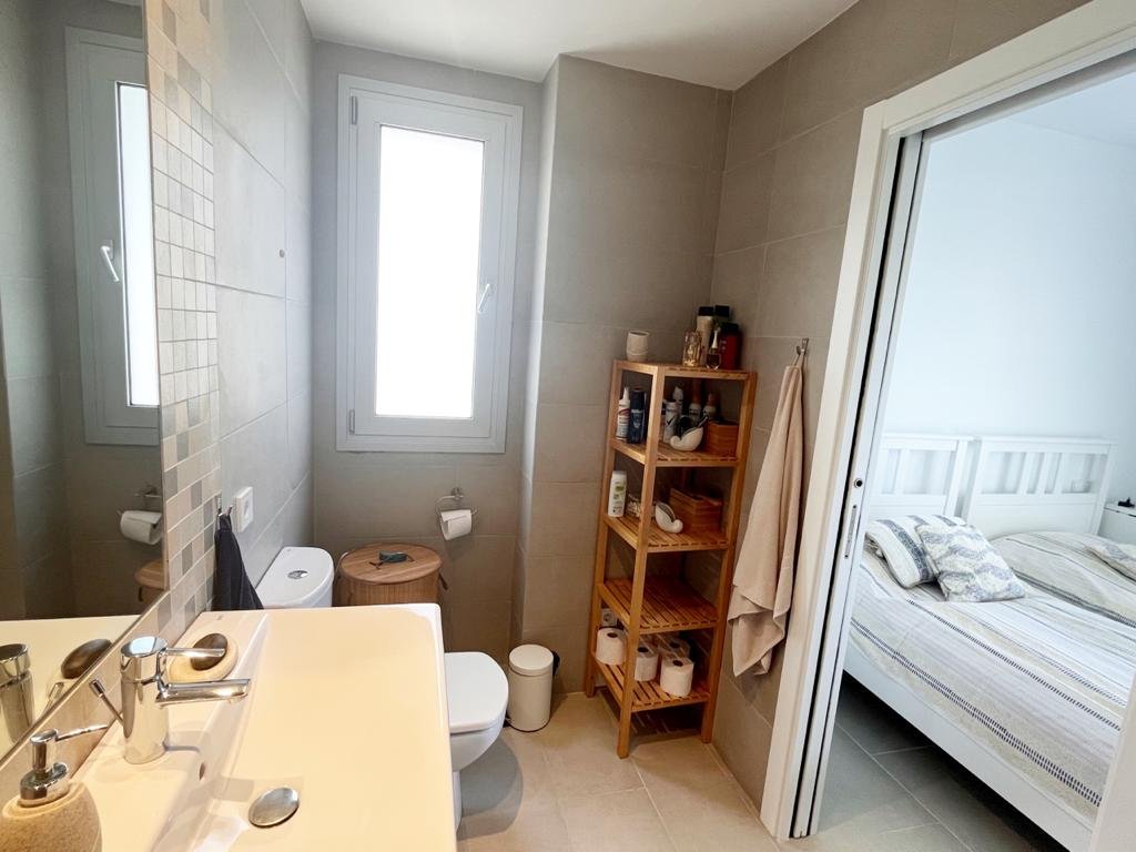 The master bedroom includes an en suite bathroom. The second bedroom uses a shower room with access from the hallway, which also functions as a guest toilet. The bedrooms are equipped with electric shutters.