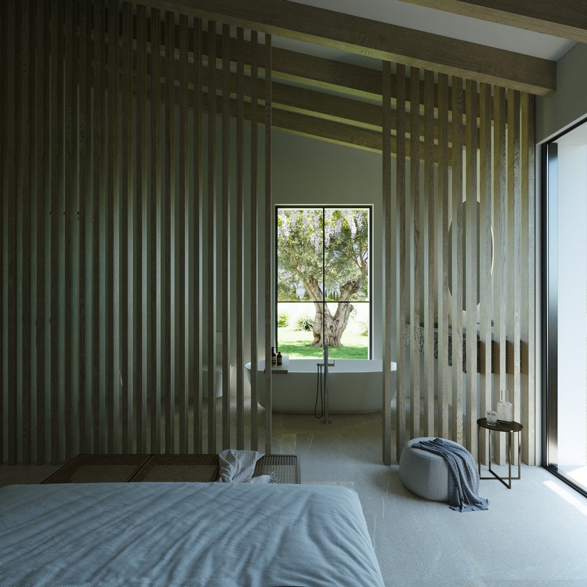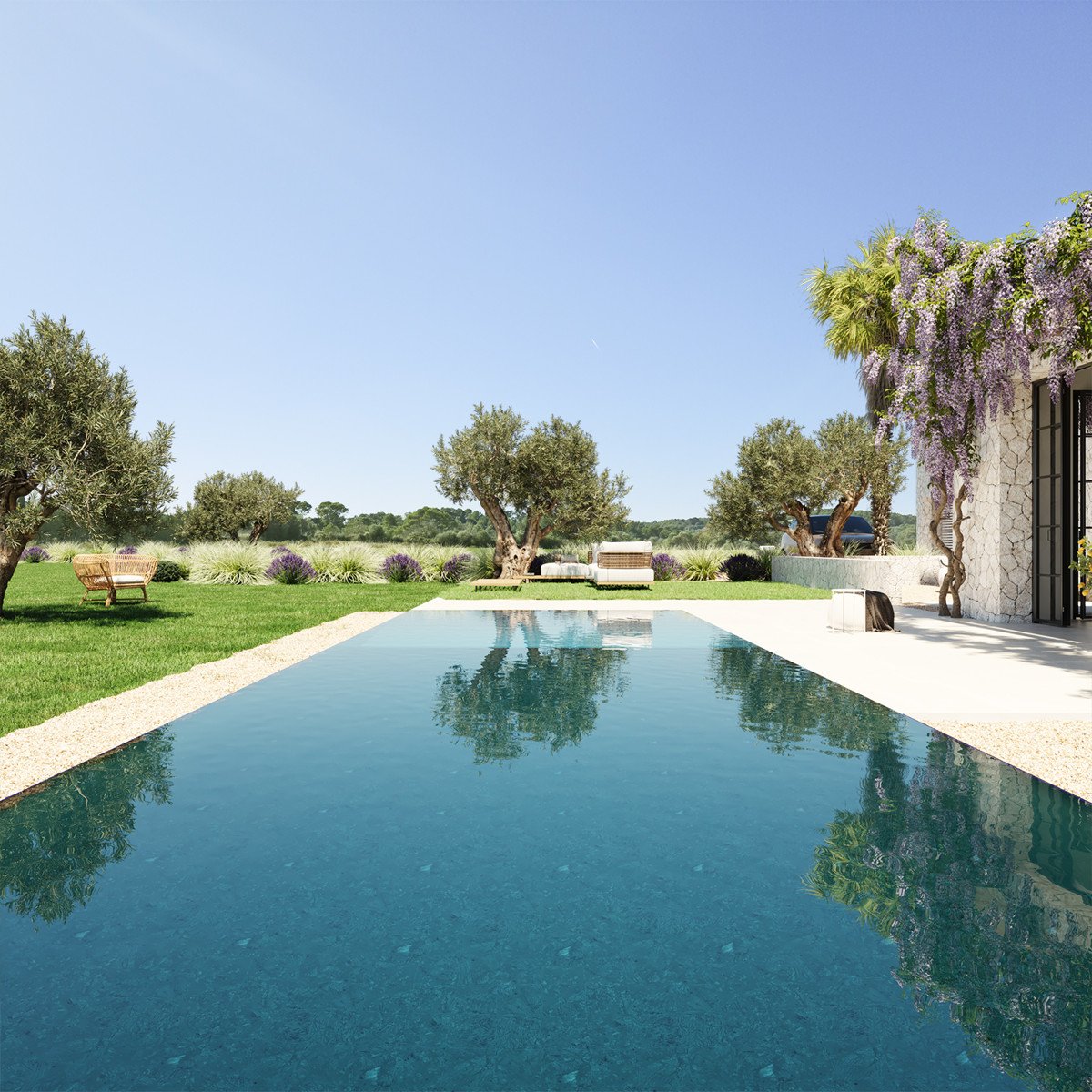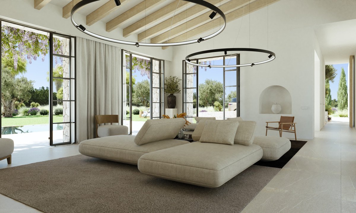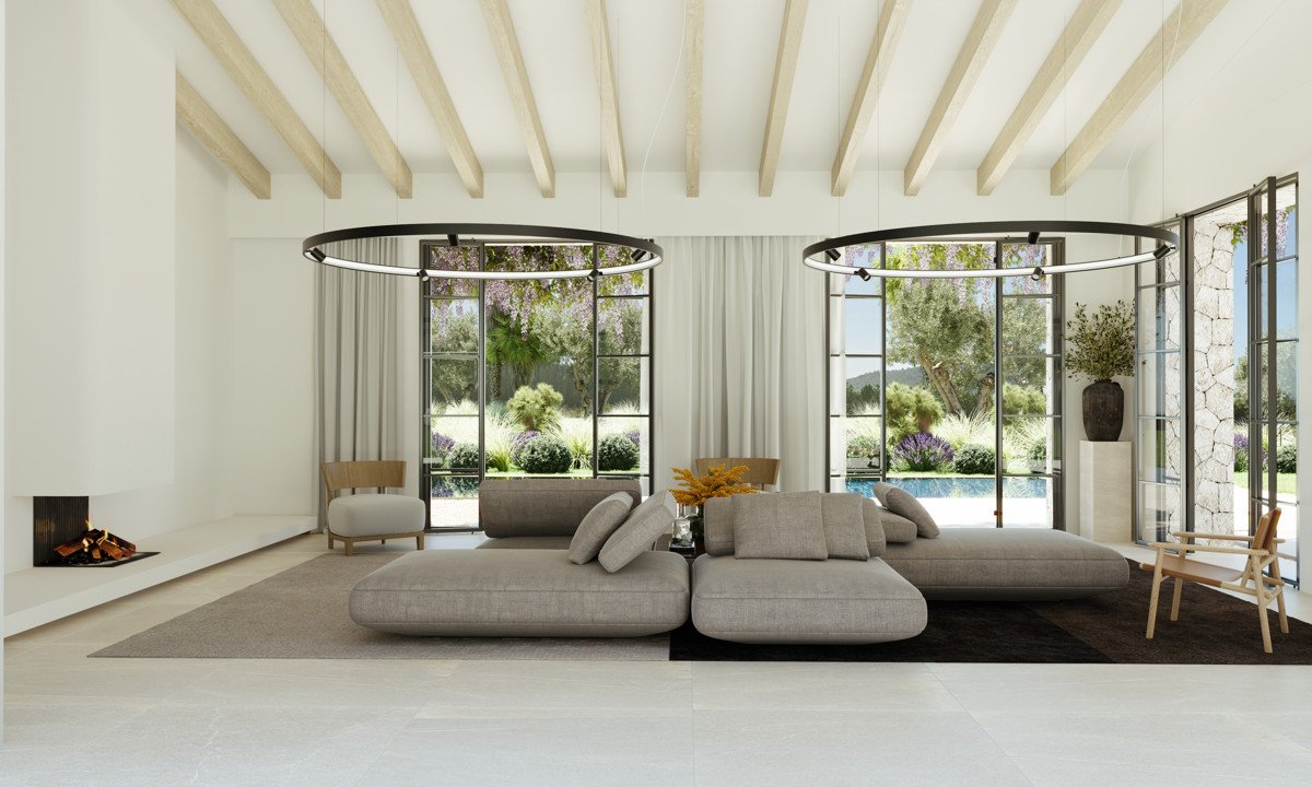 Siguiendo el pasillo hasta el final, se llega al salón de 42 m². Un amplio ventanal proporciona mucha luz y una transición perfecta a la terraza y la piscina.