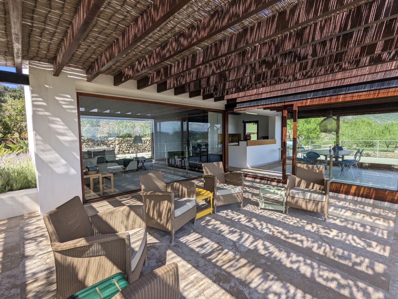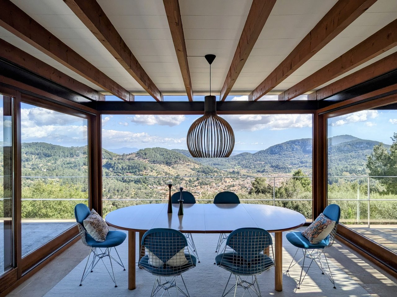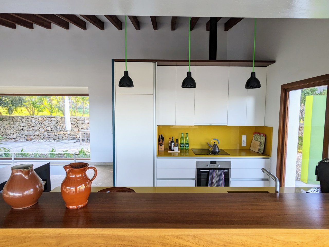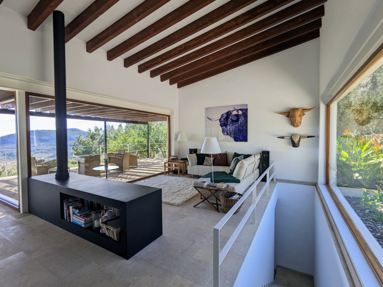 Upon entering the house, the entrance area with practical built-in cupboards leads directly into the open-plan living area, which skilfully blends the outside and inside with sliding window elements that guarantee a great view throughout the living area. The open-plan kitchen invites you to cook together and enjoy the marvellous view, which you can of course also enjoy from the couch. The dining area offers this fantastic view all year round and in any weather, thanks to the large window elements. Even on the few winter days on Mallorca, the underfloor heating and fireplace can provide relief.
