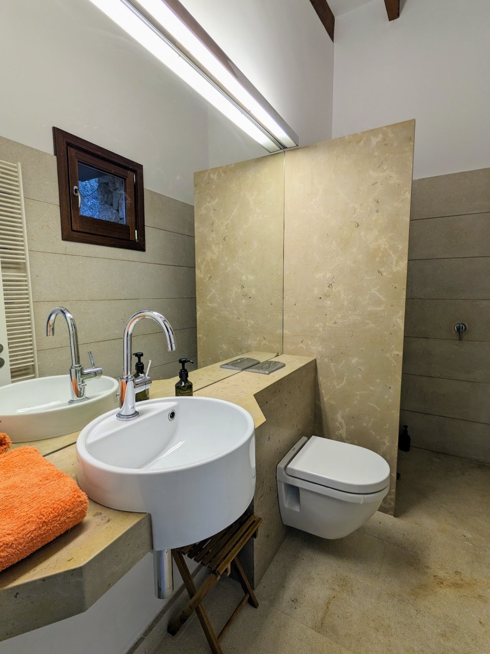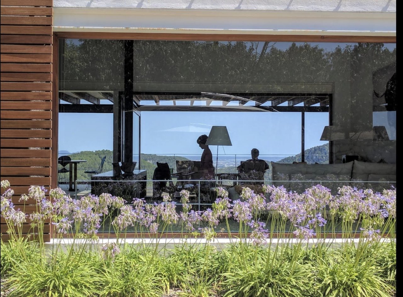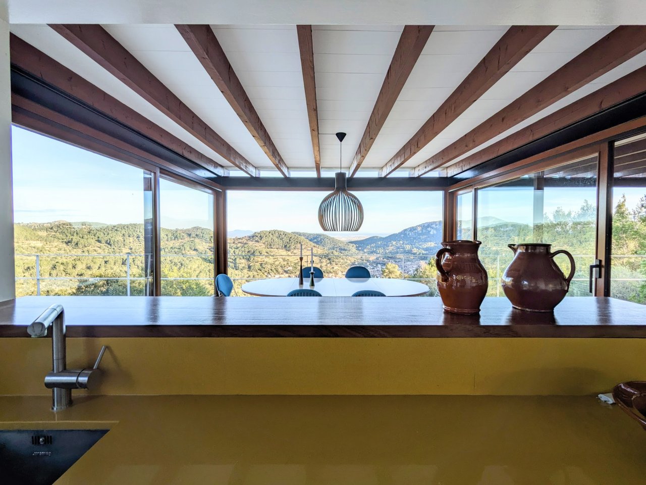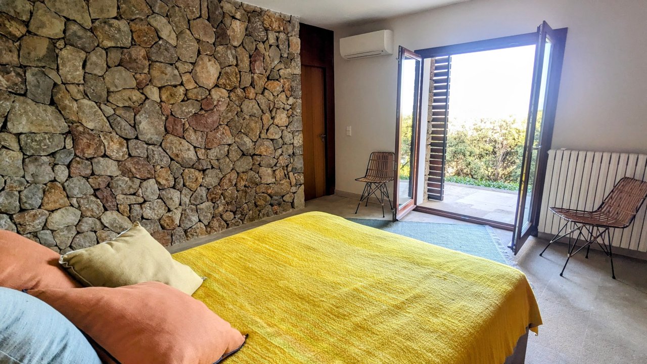 Upon entering the house, the entrance area with practical built-in cupboards leads directly into the open-plan living area, which skilfully blends the outside and inside with sliding window elements that guarantee a great view throughout the living area. The open-plan kitchen invites you to cook together and enjoy the marvellous view, which you can of course also enjoy from the couch. The dining area offers this fantastic view all year round and in any weather, thanks to the large window elements. Even on the few winter days on Mallorca, the underfloor heating and fireplace can provide relief.