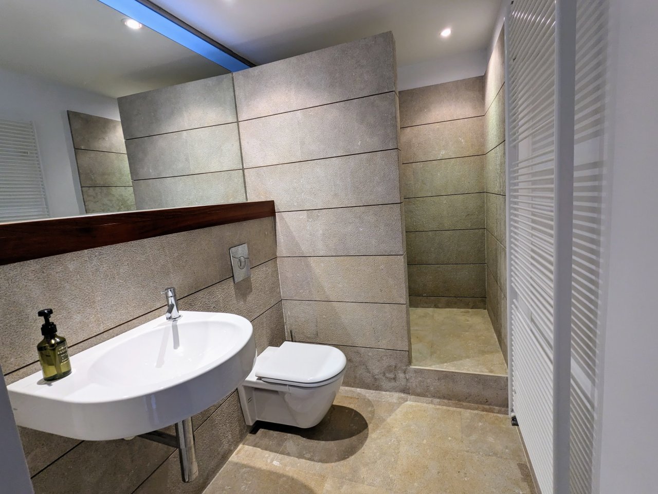 In the lower part of the main house there are 3 bedrooms and 2 have an en suite bathroom. The two front bedrooms have direct access to the garden and pool area.