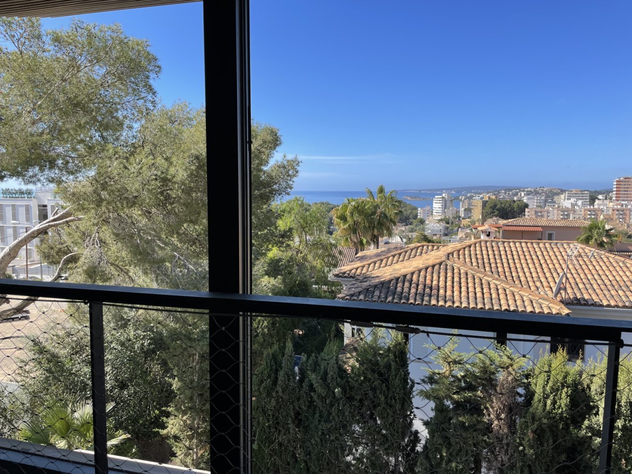 En passant par le balcon, on accède par un escalier en colimaçon à la terrasse sur le toit avec une douche extérieure, une piscine privée et un solarium. De là, vous pouvez également profiter d'une vue imprenable sur Palma et la mer.